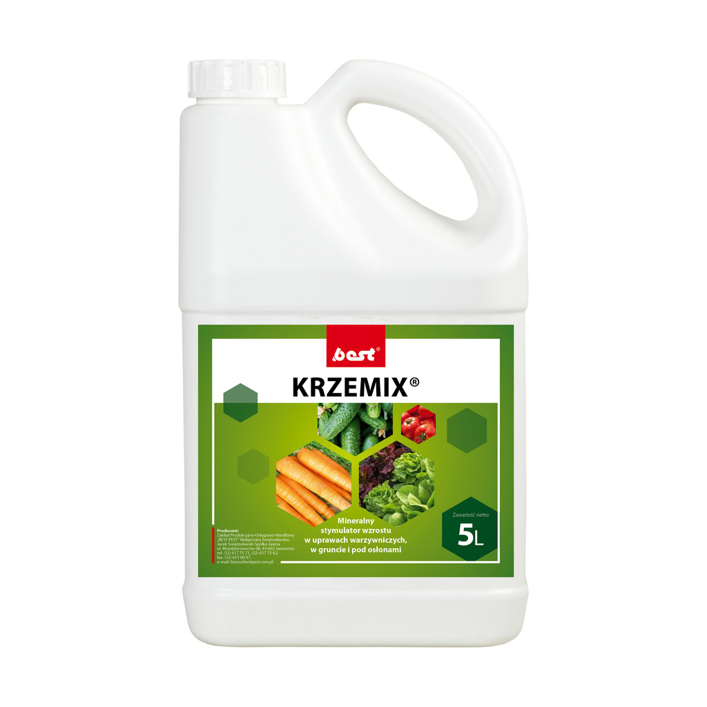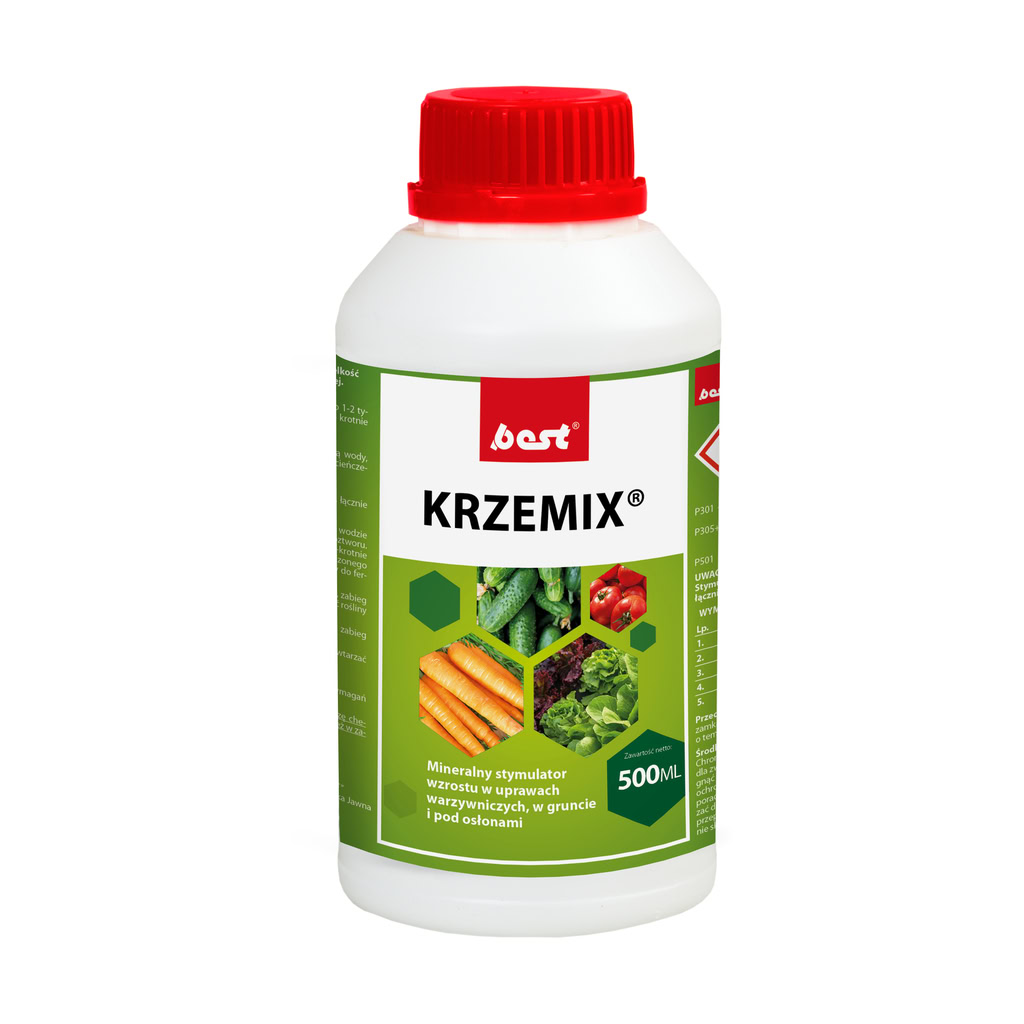 jpierw sporządzić w oddzielnym zbiorniku stężony 0,5 % roztwór pożywki – w wodzie mieszając 5 litrów KRZEMIX®u w proporcji na 1 000 litrów roztworu. Następnie sporządzić 0,005 % ciecz użytkową do fertygacji, rozcieńczając 100-krotnie w wodzie wcześniej sporządzony 0,5% roztwór pożywki.